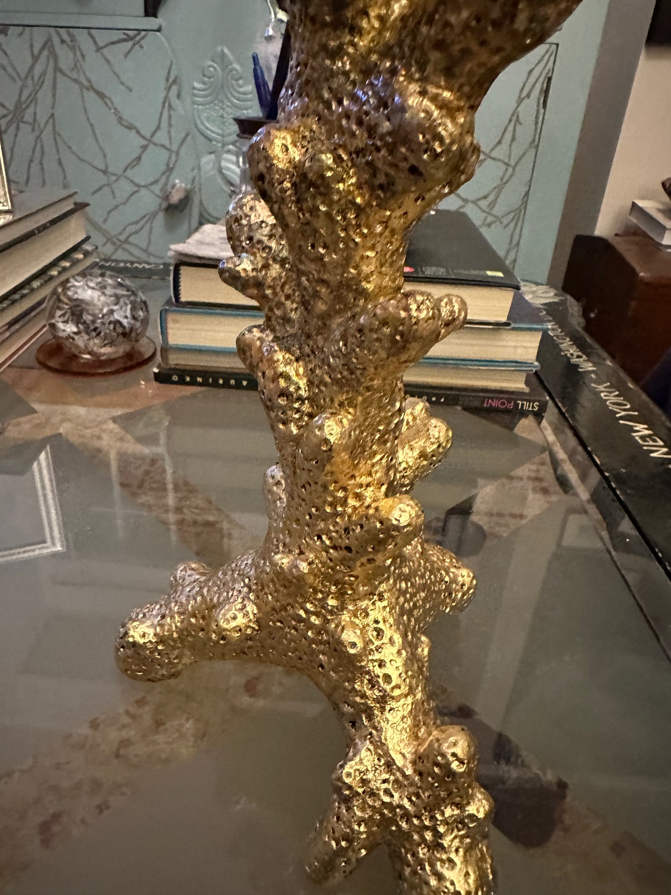 This stunning pair of candle holders have been hand gilded in two tones - solid gold color and a beautiful mottled blue variegation. The taller is 14.5” from the base to the candle platform, the shorter is 10.5” from the base to the candle platform. Each holds a 3”d pillar candle. One of a kind. Not exterior pates. Clean with water dampened cloth only. Sold as a pair.