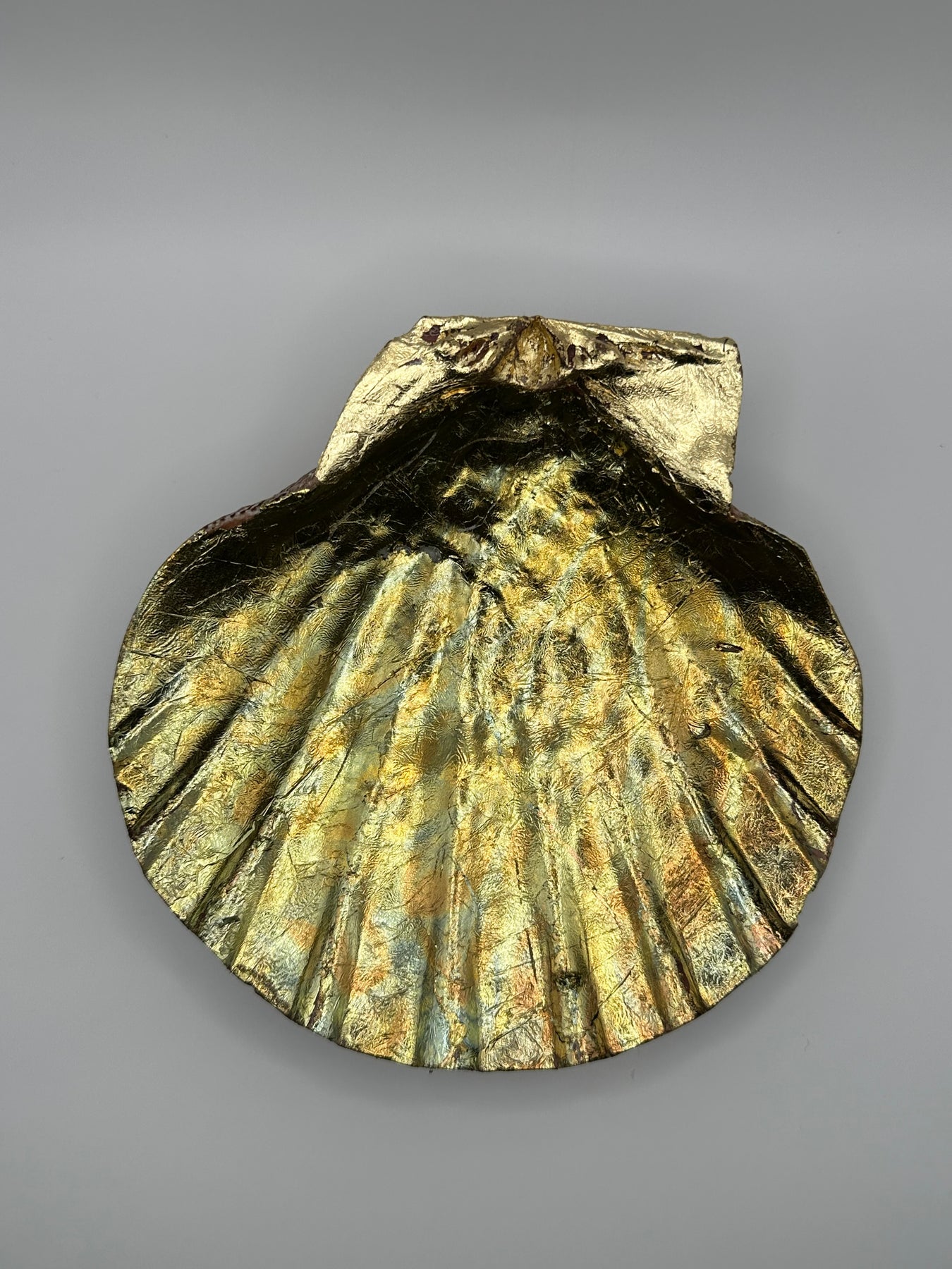 Beautifully gilded giant scallop shells. Approx 5”x 5”. Perfect for tea lights, trinkets and are drilled to hold incense sticks. These are all done with various variegated composition leaf